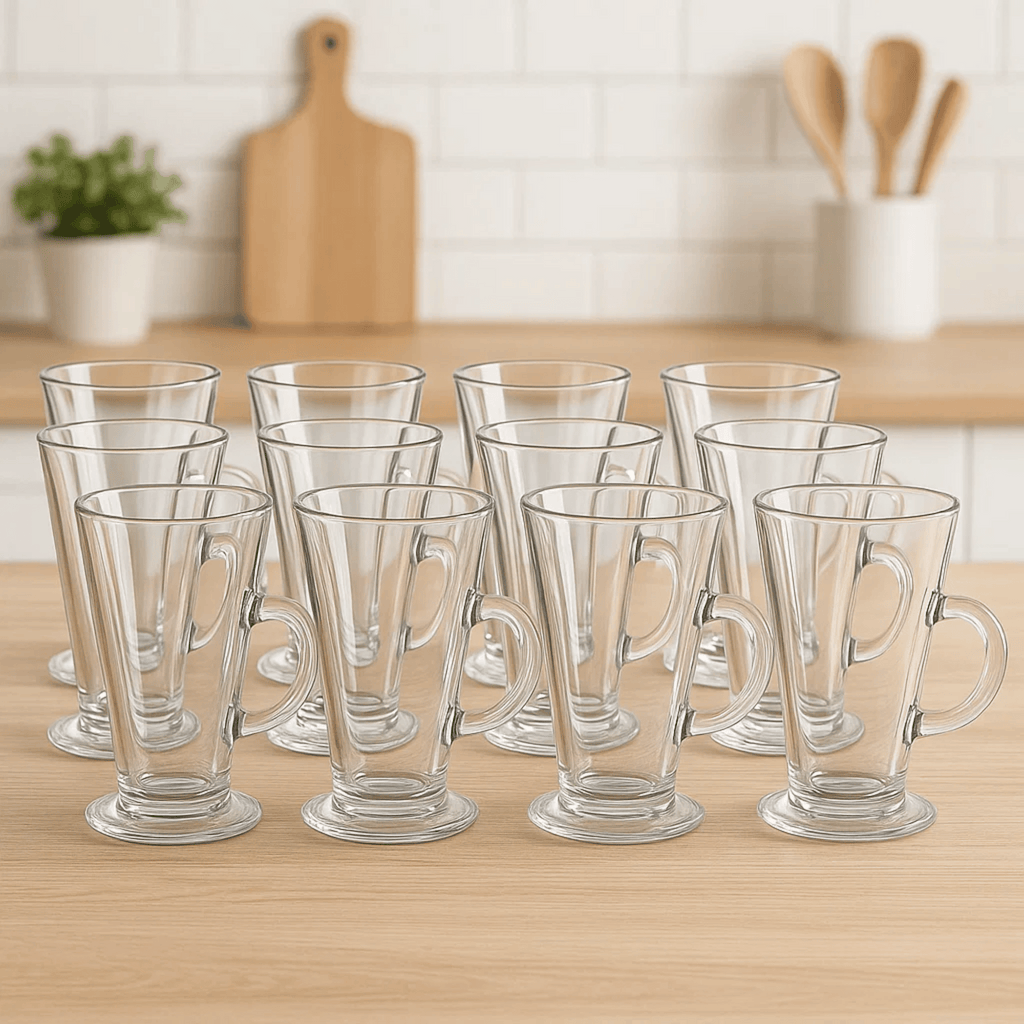 Set x12 Tarros de Vidrio Irish Coffee 266 ml – Vasos con Asa para Café, Té o Postres