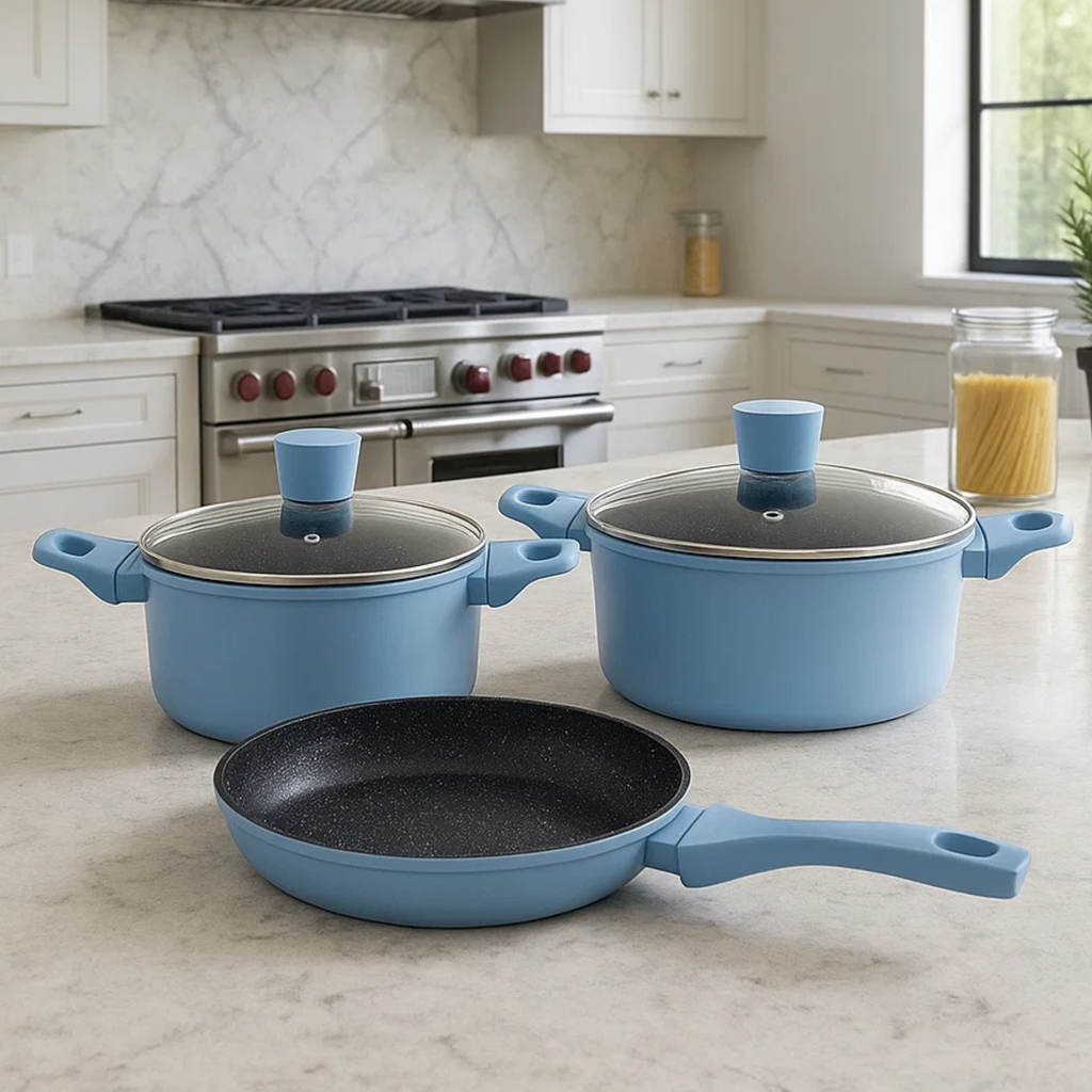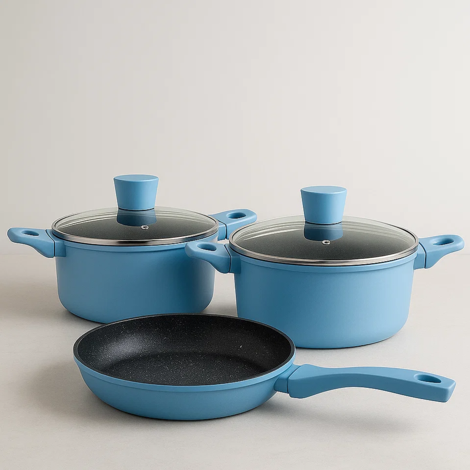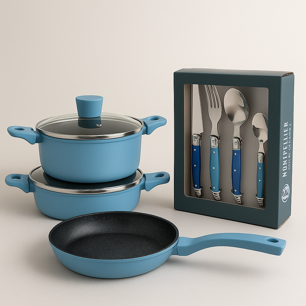 BATERIA ALUMINIO FORJADO CERAMICA BRISTOL SKY (Sarten 20cms, Olla 20 y 24cms con tapa) + SET CUBIERTOS 24 PZS MONTPELLIER AZUL