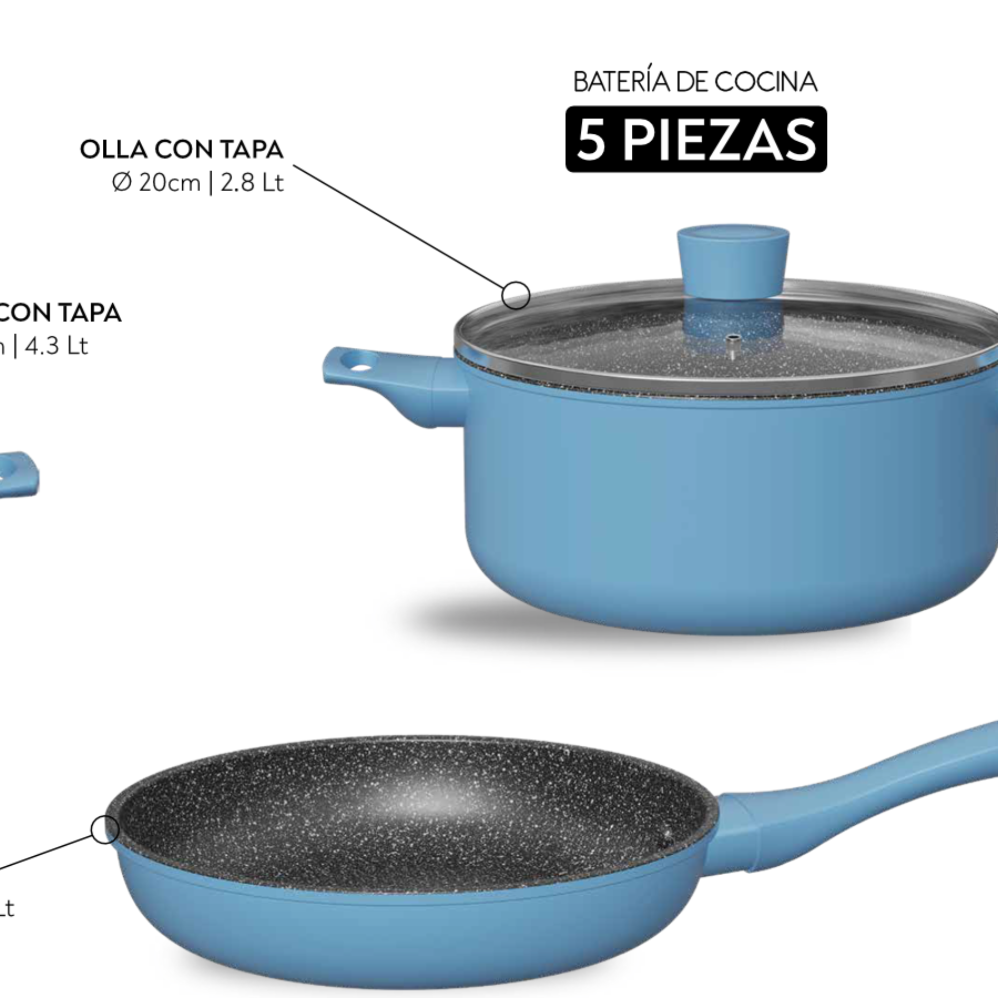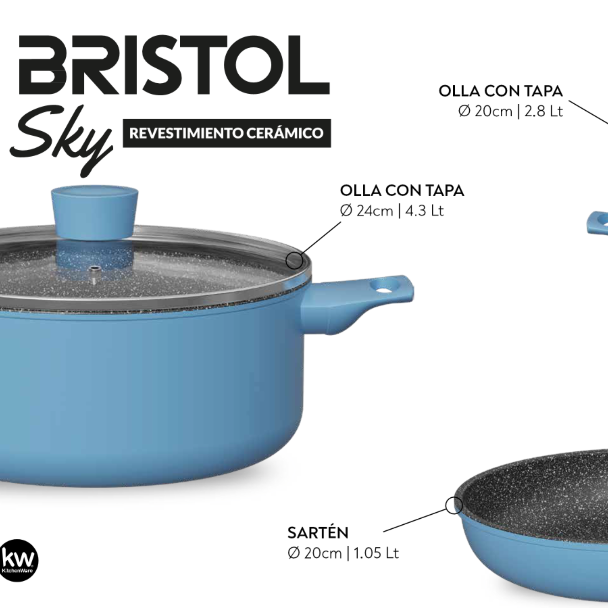 Equipa tu cocina con un combo completo y de alta calidad. La batería Bristol Sky está fabricada en aluminio forjado con recubrimiento cerámico antiadherente, ideal para cocinar con menos aceite, evitar que los alimentos se peguen y lograr una cocción pareja en todo momento.