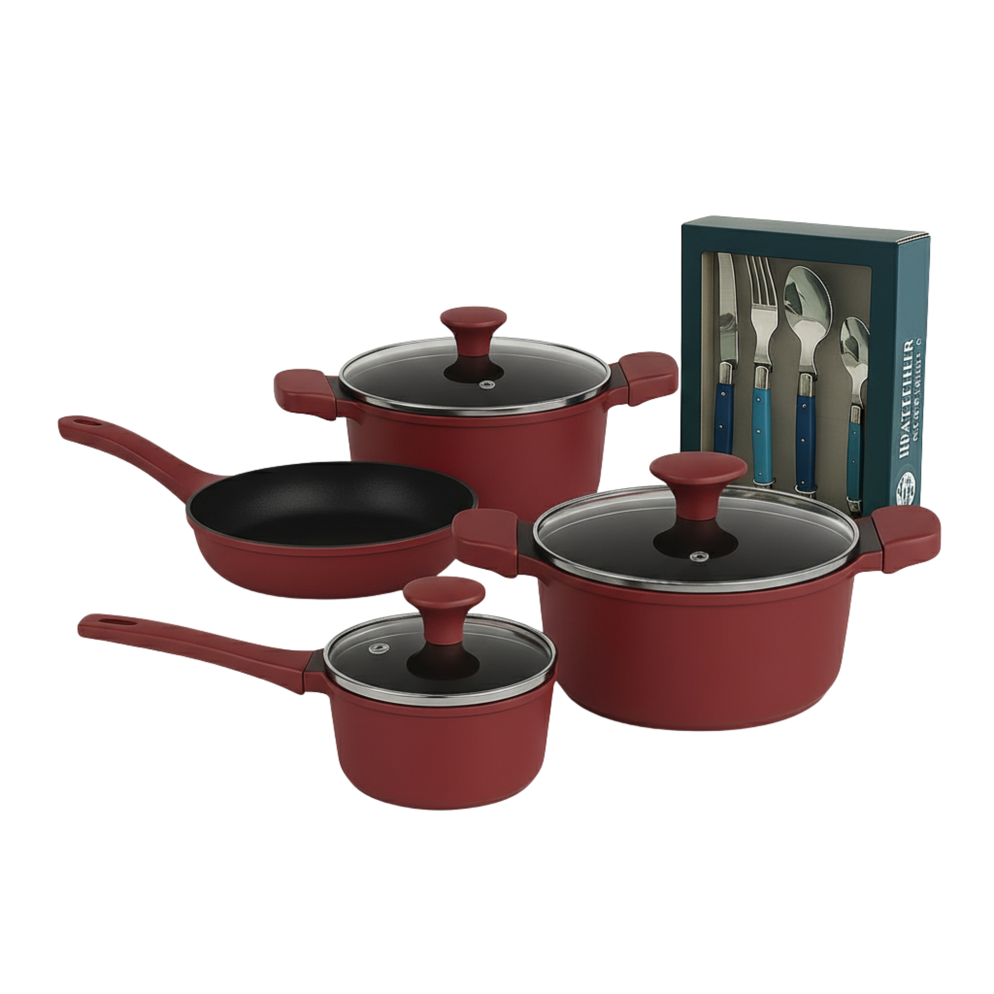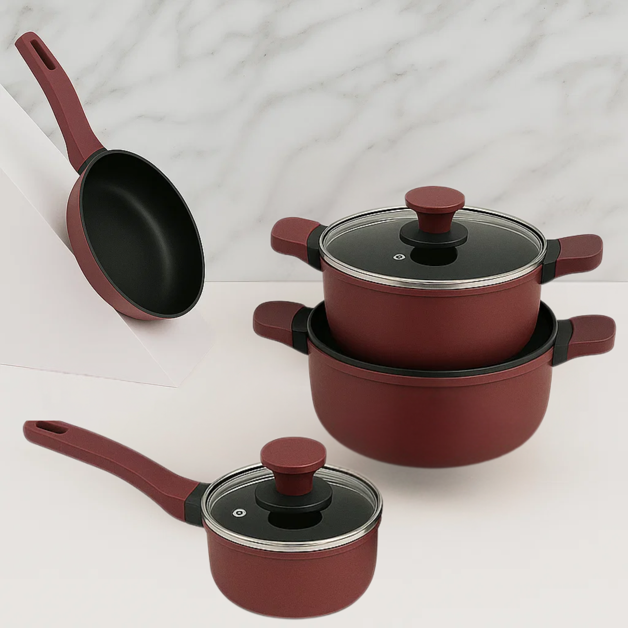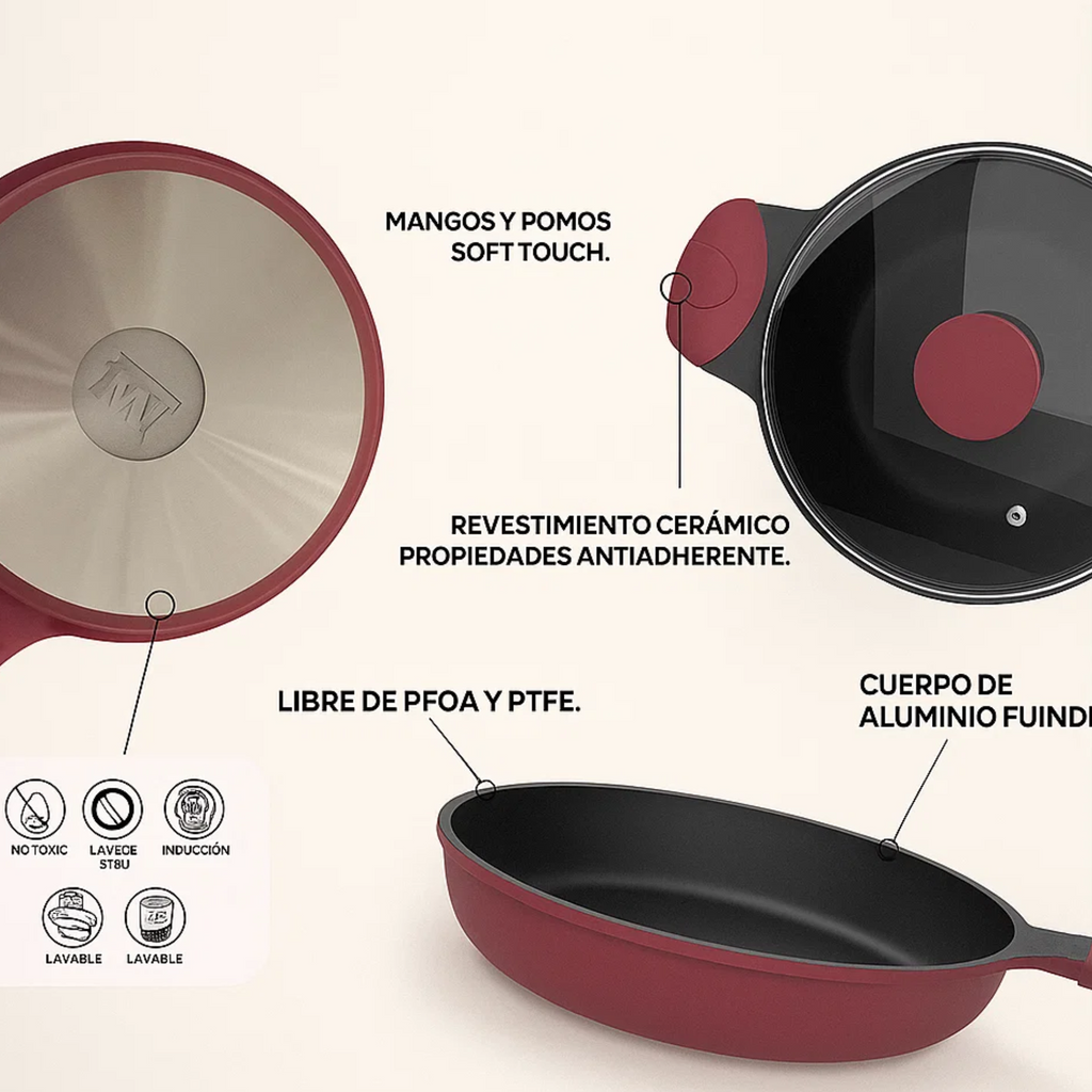Equipa tu cocina con un combo completo y de alta calidad. La batería Cerámica berries está fabricada en aluminio fundido con recubrimiento cerámico antiadherente, ideal para cocinar con menos aceite, evitar que los alimentos se peguen y lograr una cocción pareja en todo momento.