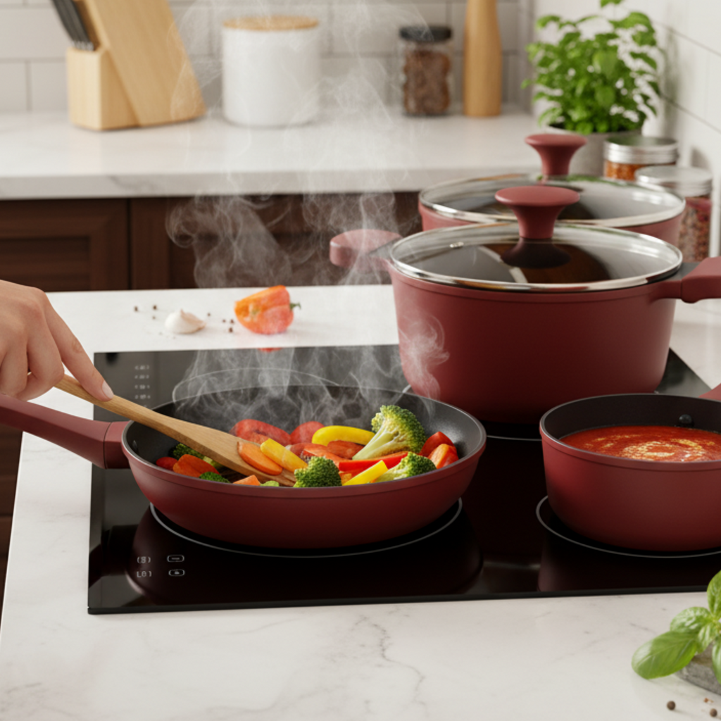 Incluye una sartén de 20 cm y dos ollas de 20 cm y 24 cm con tapas de vidrio templado, perfectas para preparar desde recetas rápidas hasta platos más elaborados. Aptas para estufas de gas, eléctricas y de inducción, fáciles de limpiar y resistentes al uso diario.