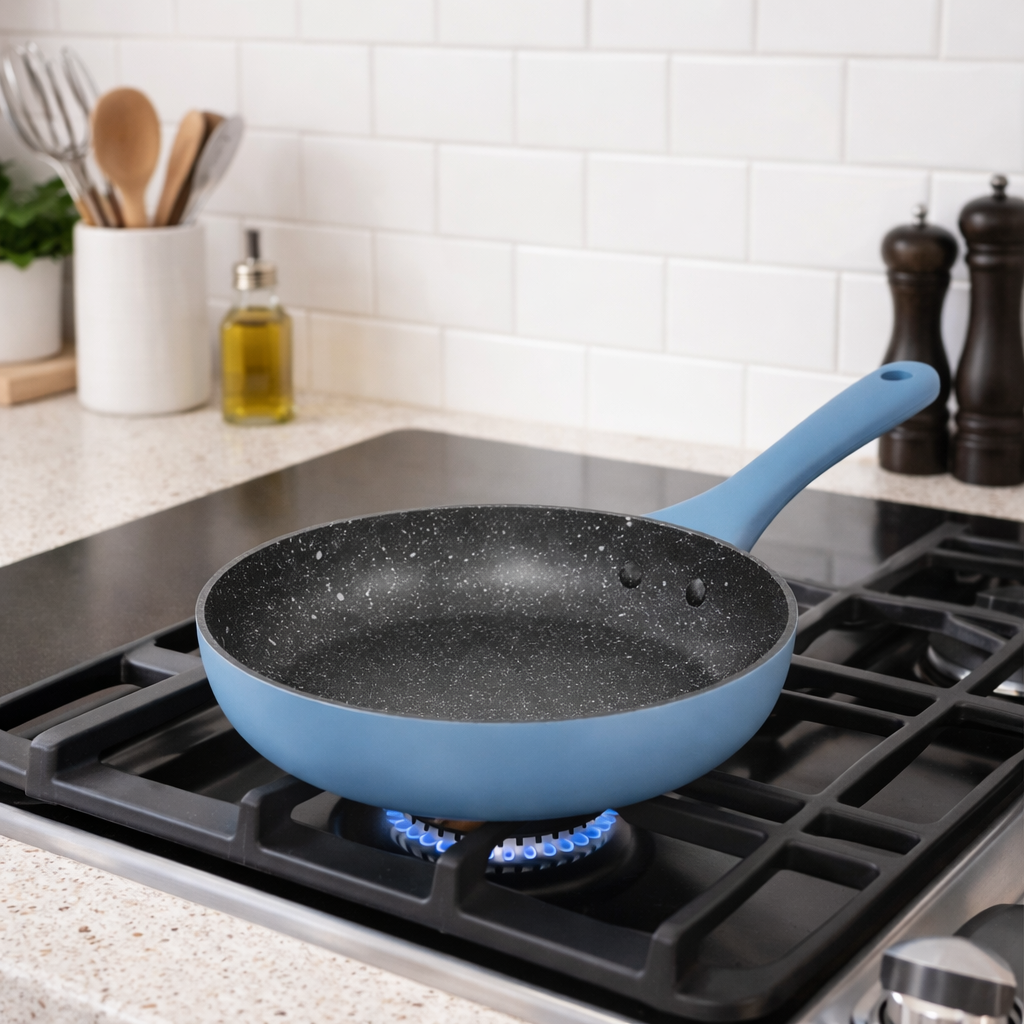 Su tamaño es ideal para cocinar carnes, huevos, arepas, salteados y porciones medianas con comodidad. El acabado en azul claro aporta un estilo fresco y elegante a tu cocina.
