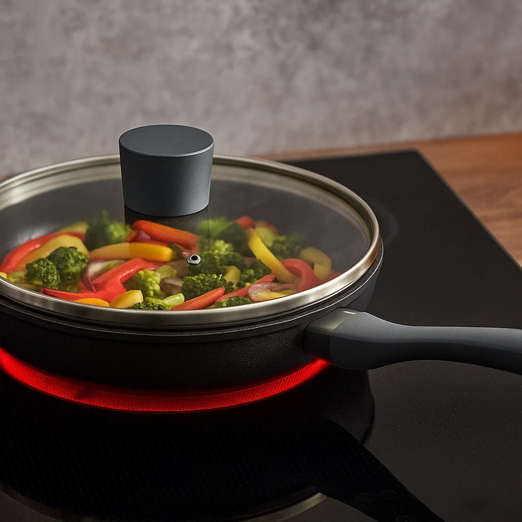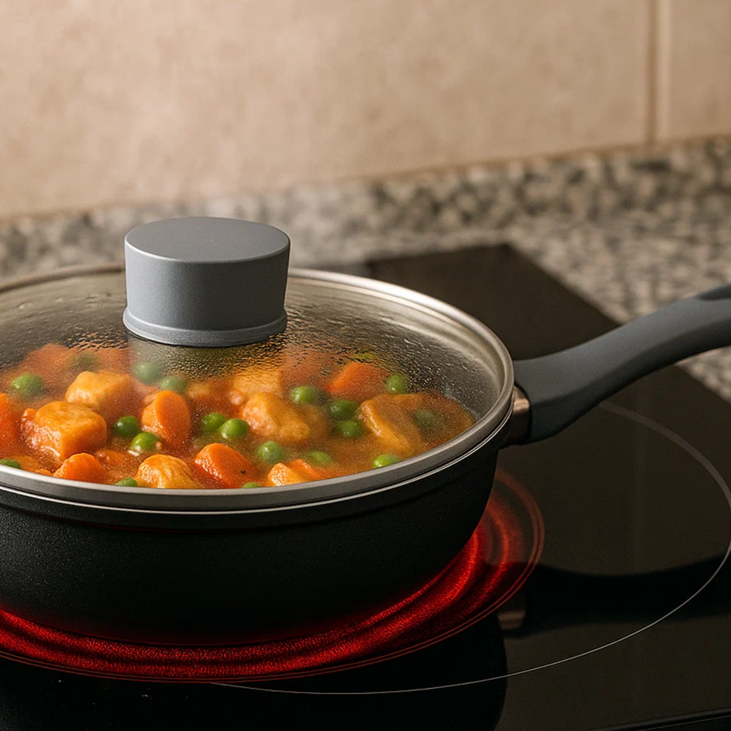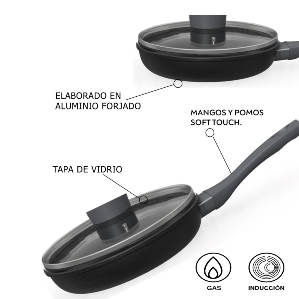 Cada sartén incluye tapa de vidrio templado, ideal para conservar el calor y realzar el sabor de cada preparación. Con mangos soft touch ergonómicos y cómodos al tacto, este set está hecho para acompañarte en recetas diarias o creaciones gourmet.