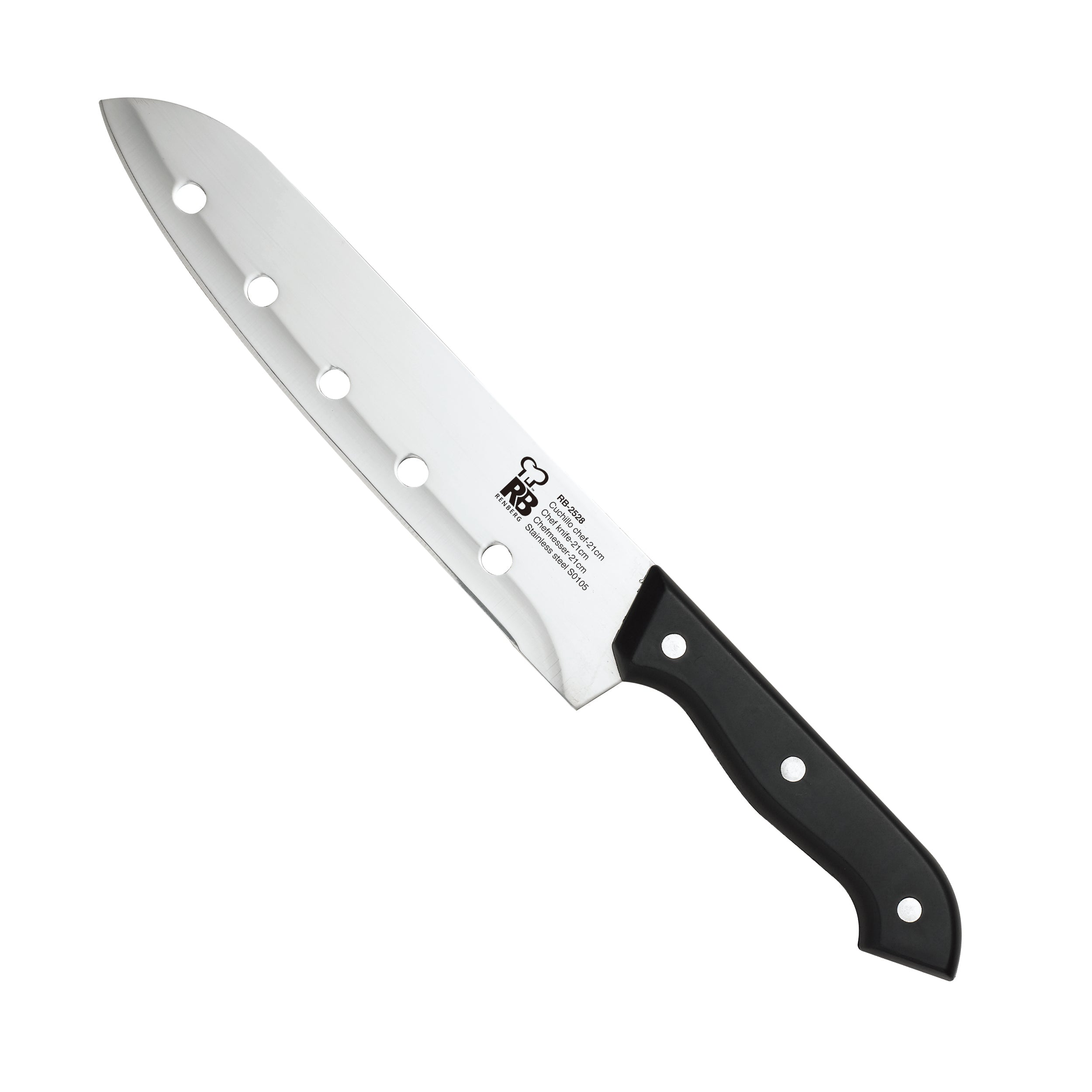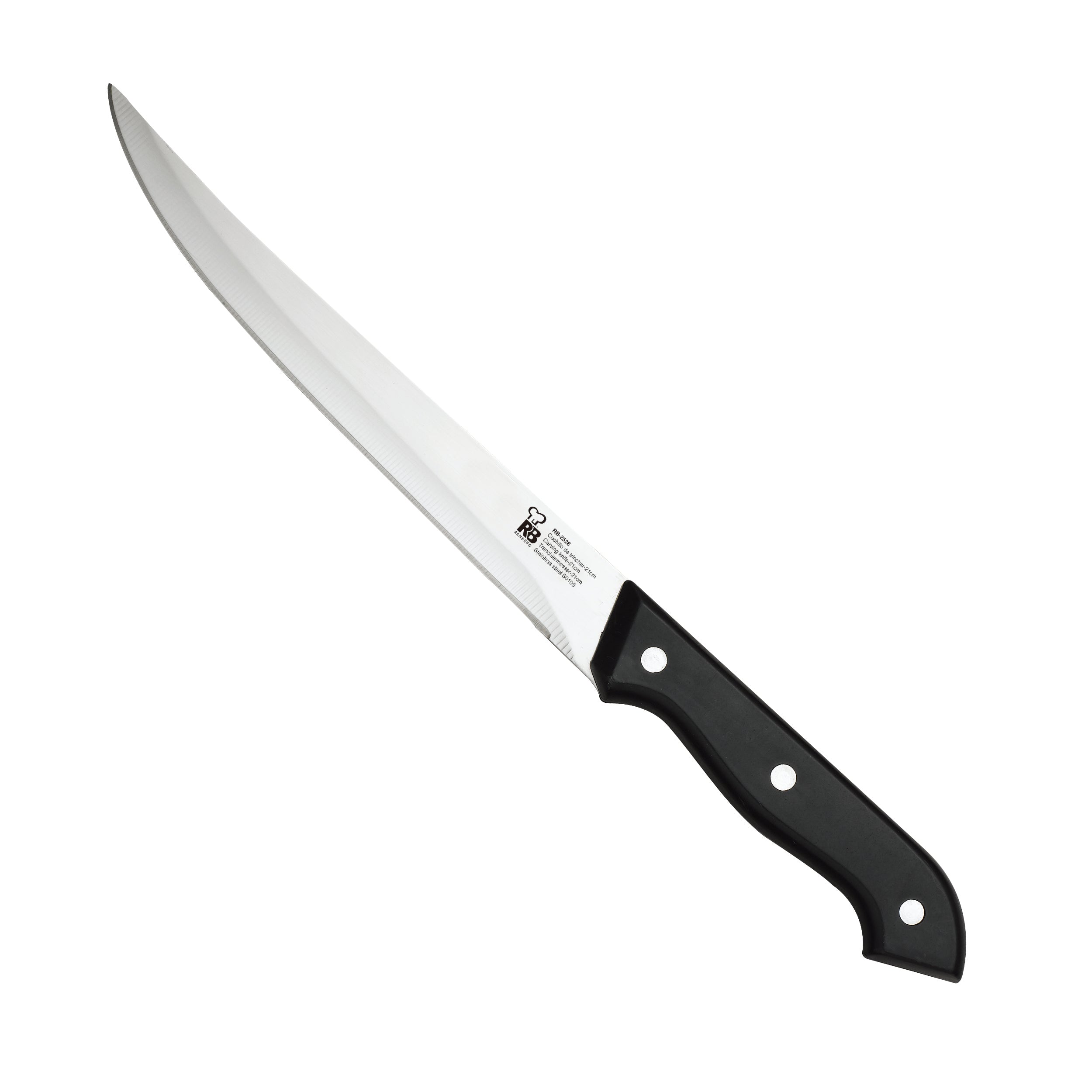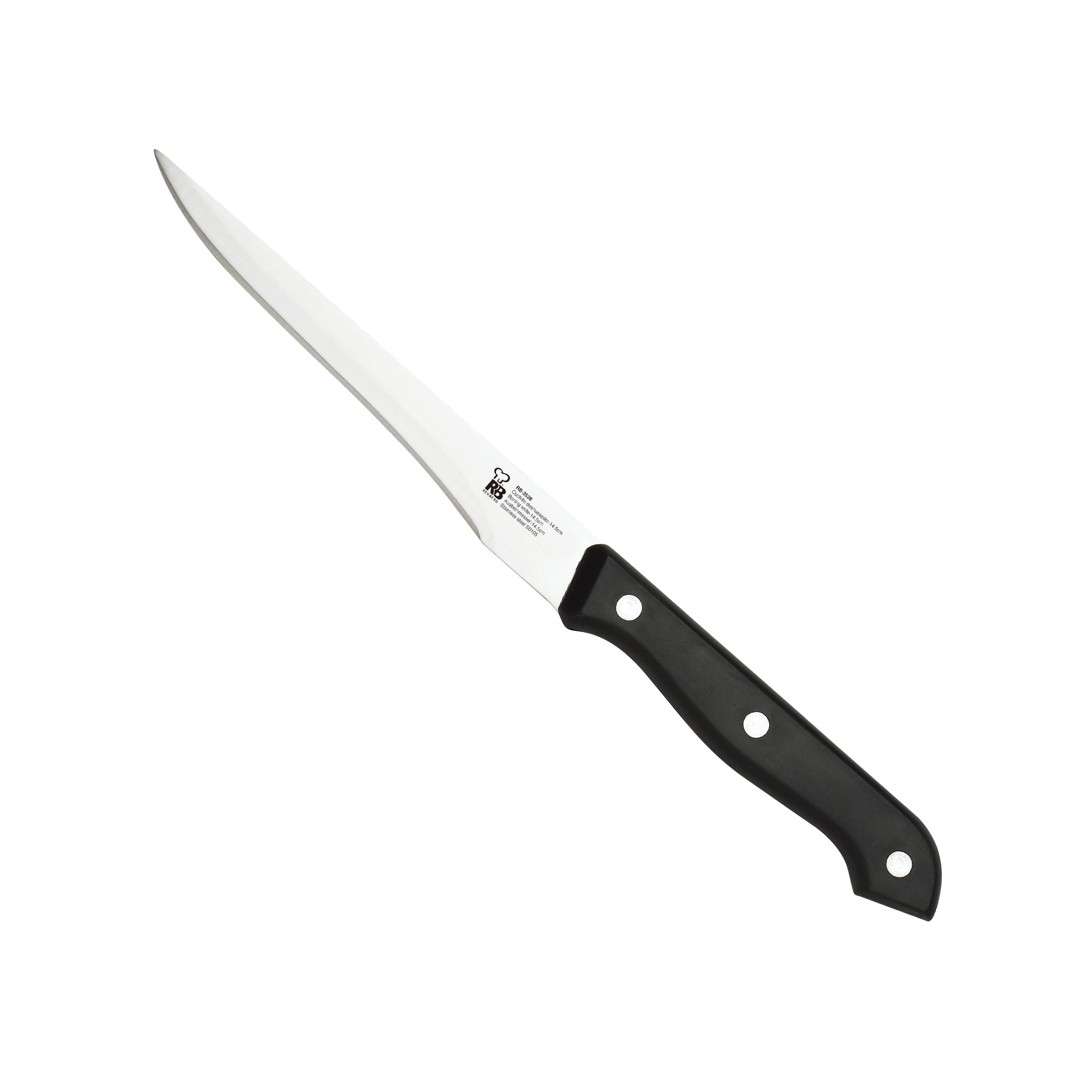 - 1 cuchillo de chef, 1 fileteador y 1 panadero de 33 cm cada uno; 1 deshuesador de 25 cm, 1 multiusos de 23,5 cm, 1 pelador de 8 cm, 1 afilador de 29 cm, 6 de 12,5cm para carne y unas tijeras de 20,5 cm.