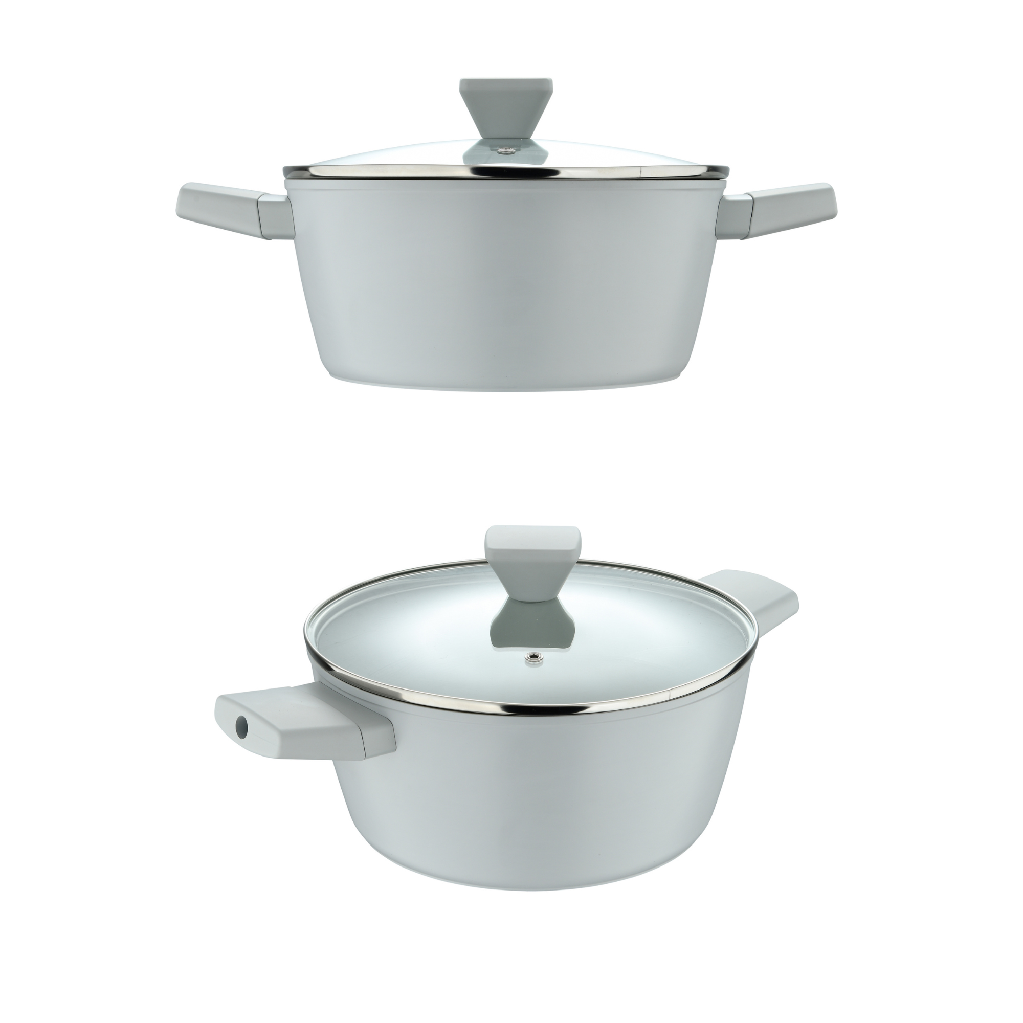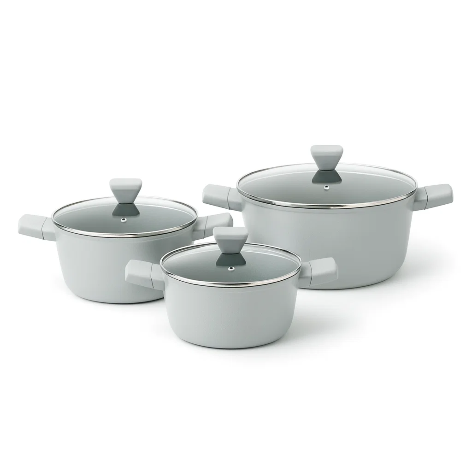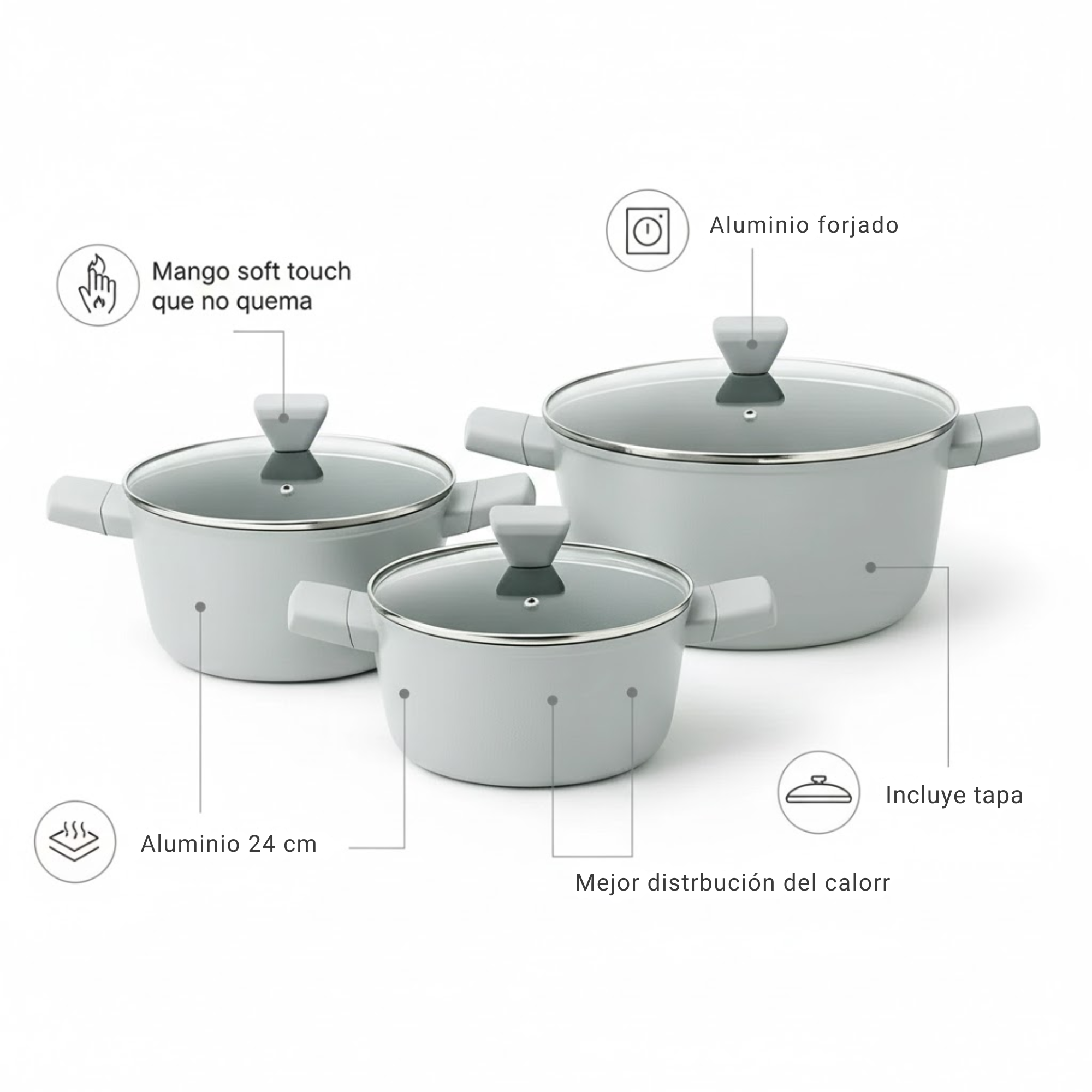 Set de ollas fabricadas en aluminio forjado, material resistente que garantiza mayor durabilidad y una distribución homogénea del calor. Apto para todo tipo de cocinas, incluida inducción, y equipado con tapas incluidas para un mejor control de la cocción. Cuenta con revestimiento libre de PFOA, ofreciendo una cocción más segura y eficiente.