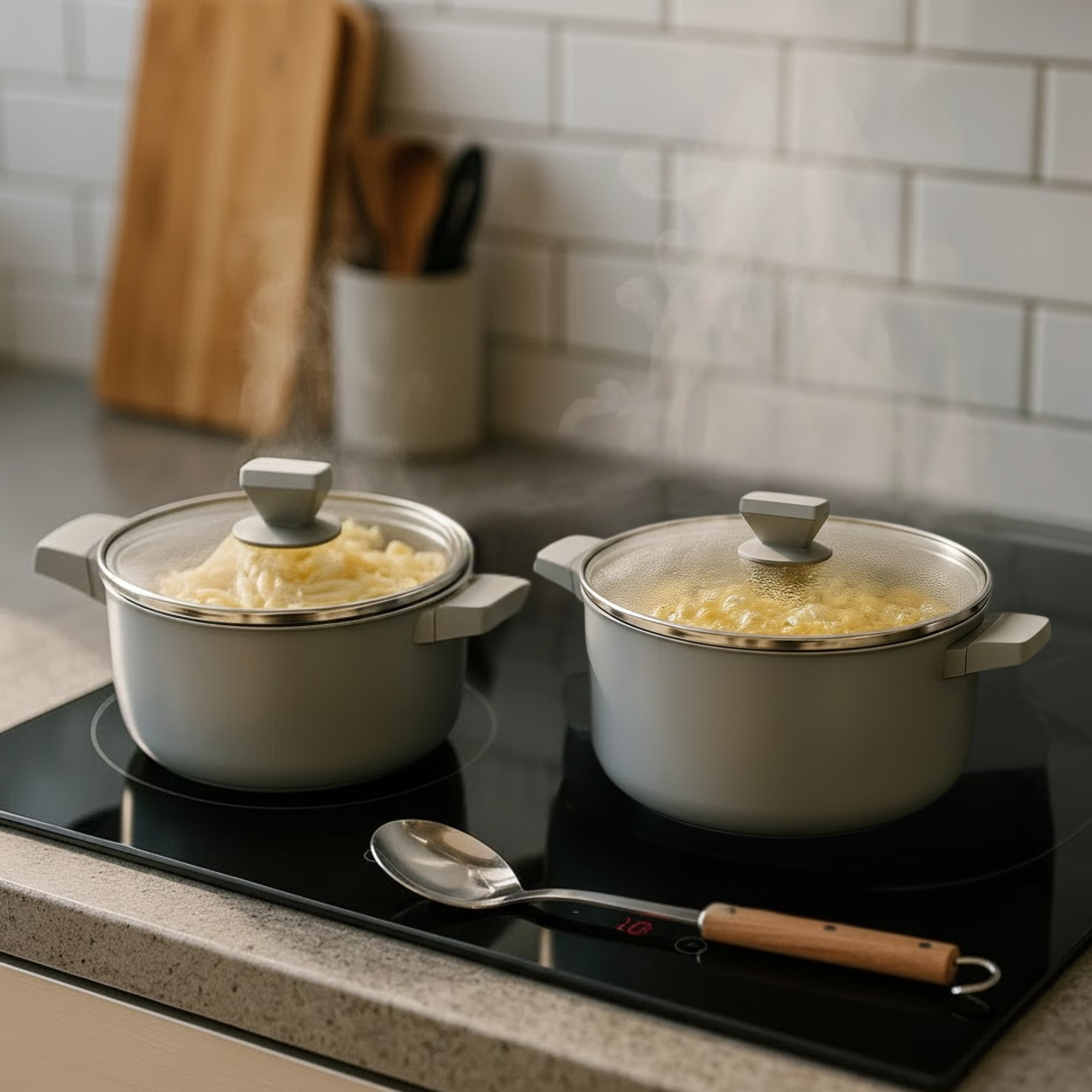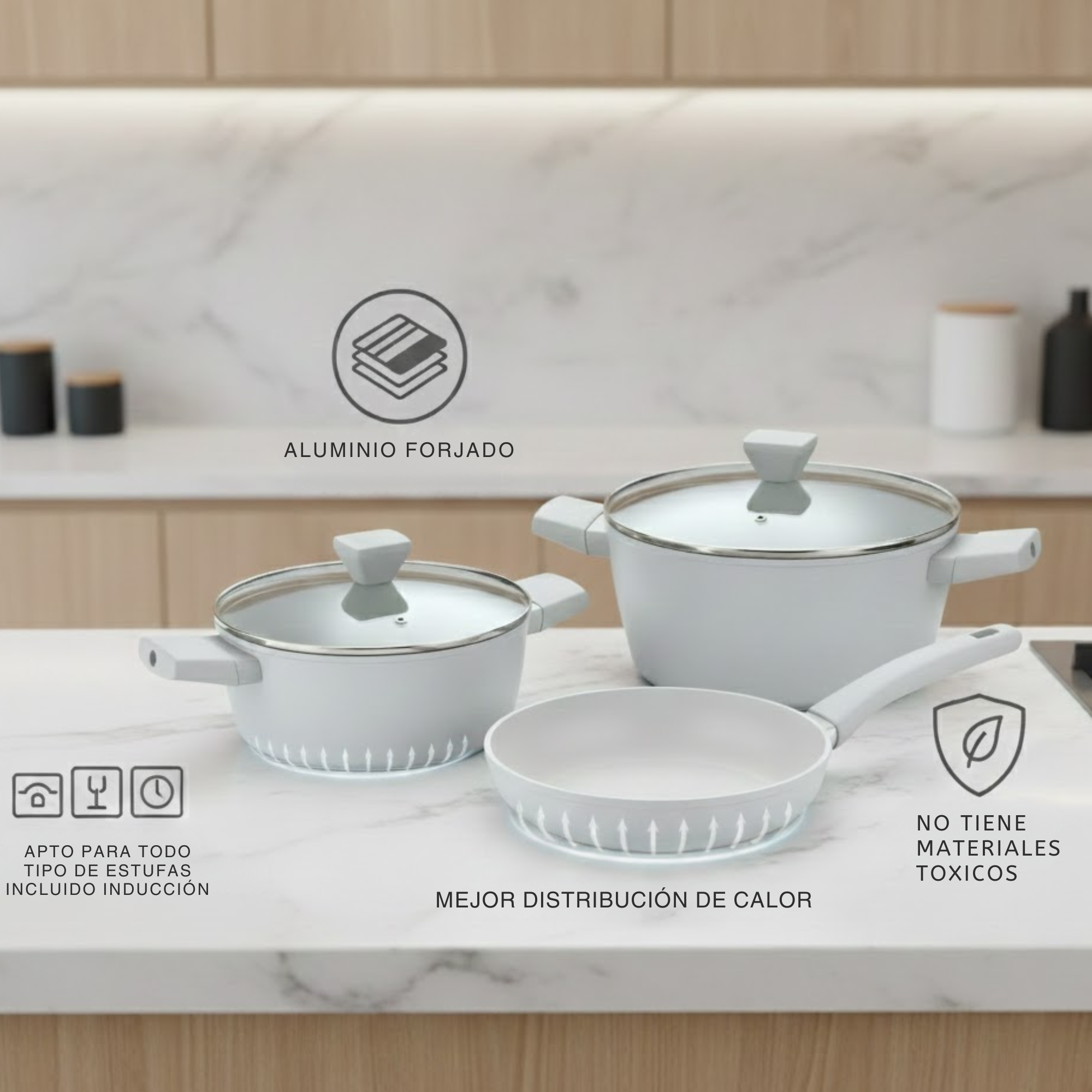 Su base está diseñada para proporcionar una distribución uniforme del calor, reduciendo puntos calientes y mejorando la eficiencia en la cocción. Compatible con todo tipo de cocinas, incluyendo inducción, gas, eléctrica, vitrocerámica y halógena.