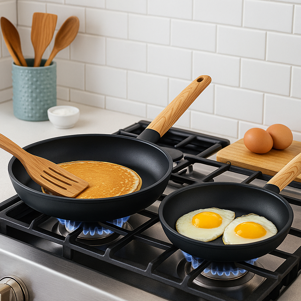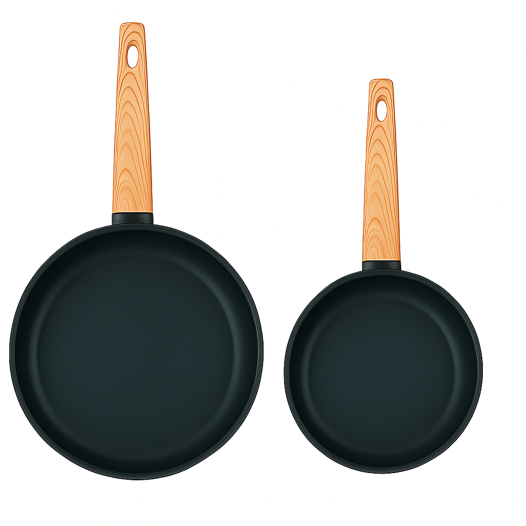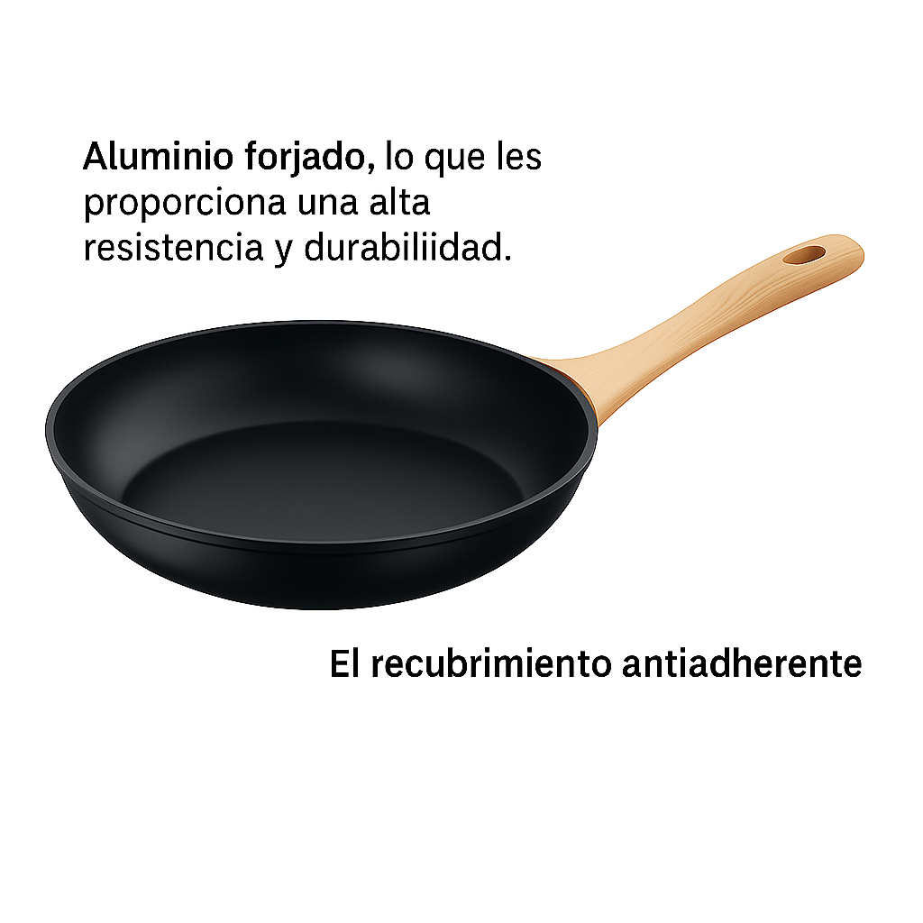 Los dos sartenes están fabricados con aluminio forjado, lo que les proporciona una alta resistencia y durabilidad. Este material también asegura una distribución uniforme del calor, mejorando la eficiencia de la cocción. El recubrimiento antiadherente ayuda a evitar que los alimentos se peguen y facilita la limpieza posterior.
