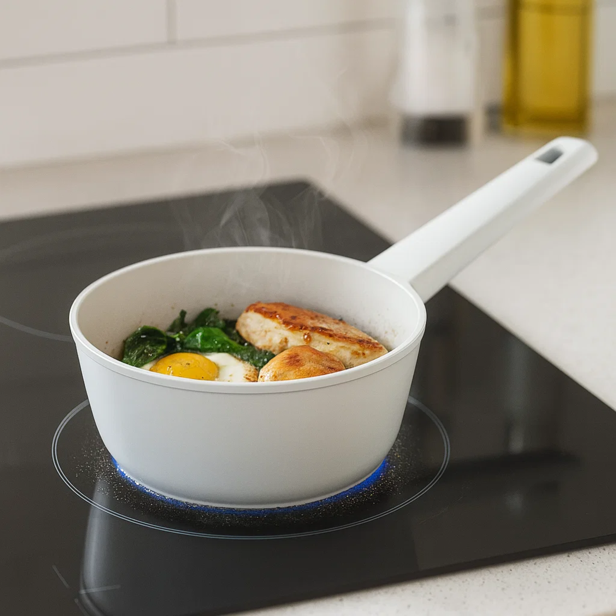 Set de cocina fabricado en aluminio forjado, material resistente que garantiza mayor durabilidad y una distribución homogénea del calor. Compatible con todo tipo de cocinas, incluida inducción, y diseñado para un uso diario eficiente. Cuenta con revestimiento libre de PFOA, ofreciendo una cocción más segura y fácil limpieza
