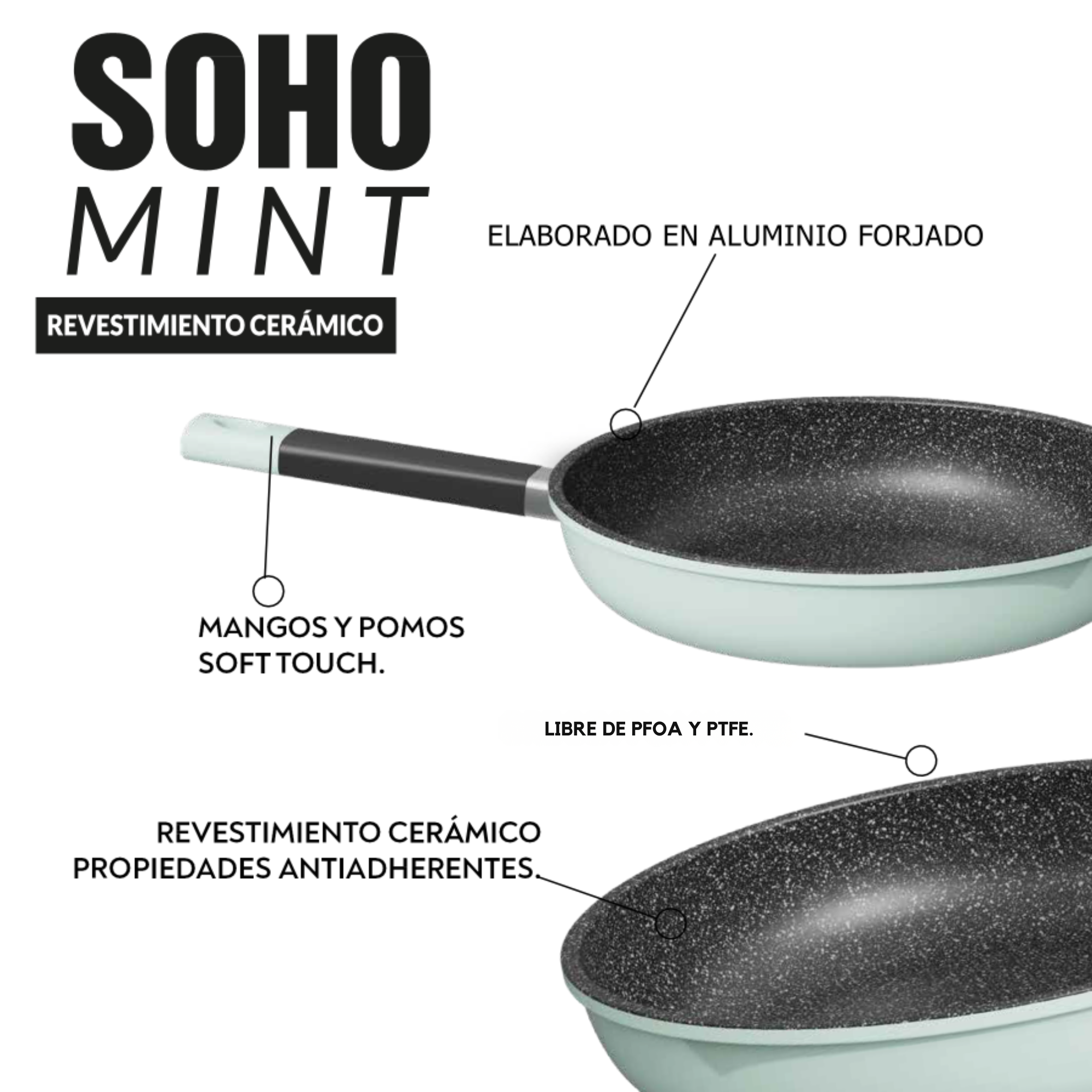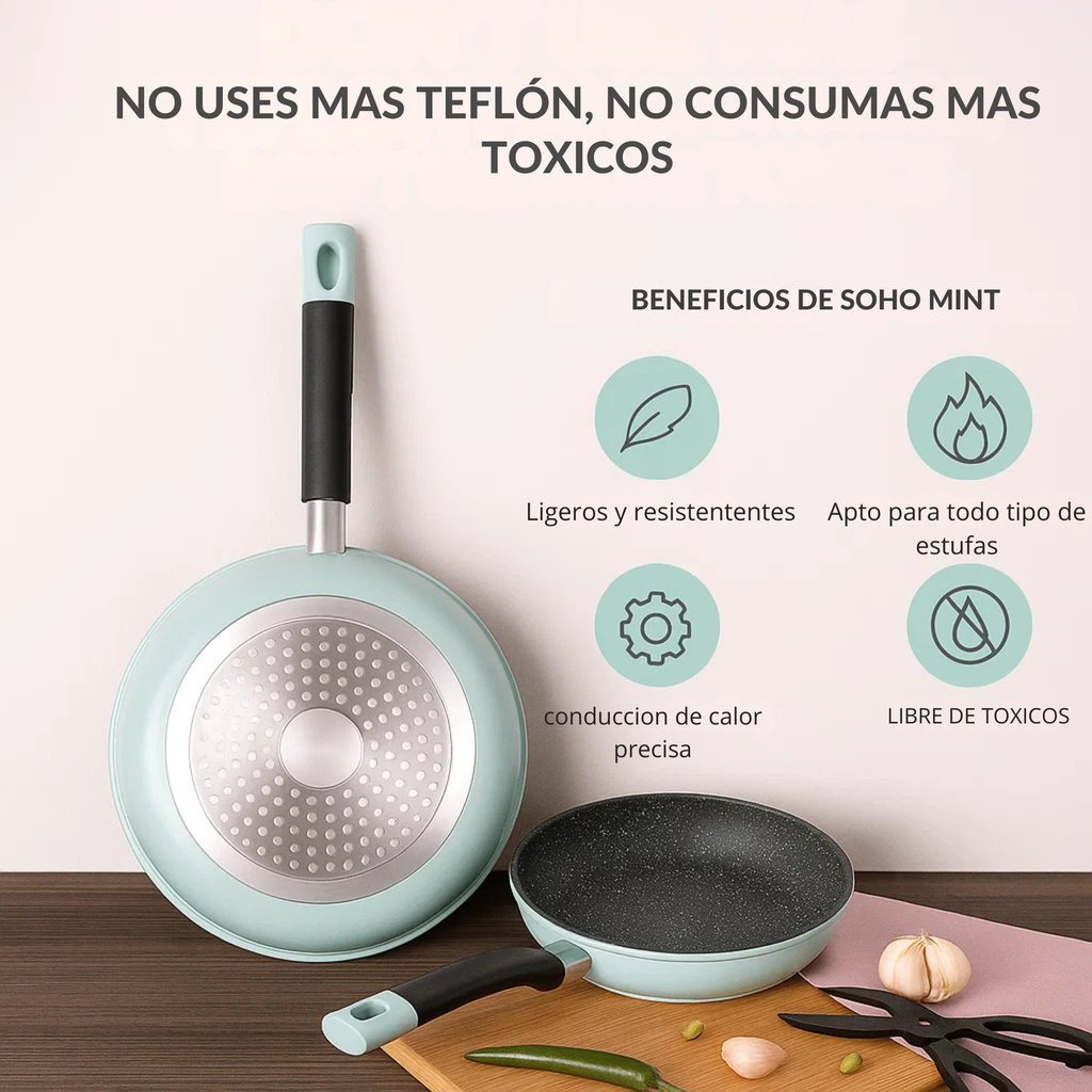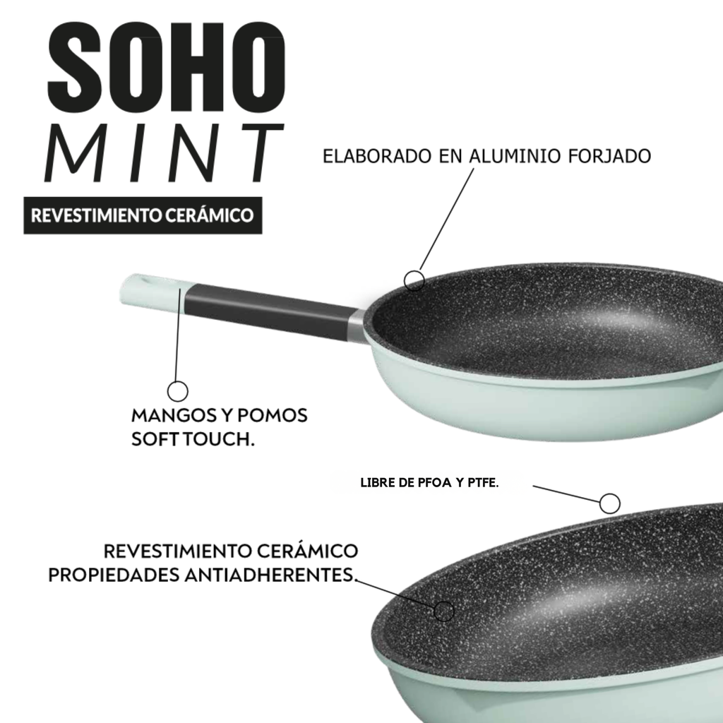 El set de sartenes Soho Mint combina diseño moderno y alto rendimiento para transformar tu experiencia en la cocina. Su elegante color mint pastel aporta estilo y frescura, mientras que su construcción en aluminio forjado ofrece una mayor durabilidad y distribución uniforme del calor.